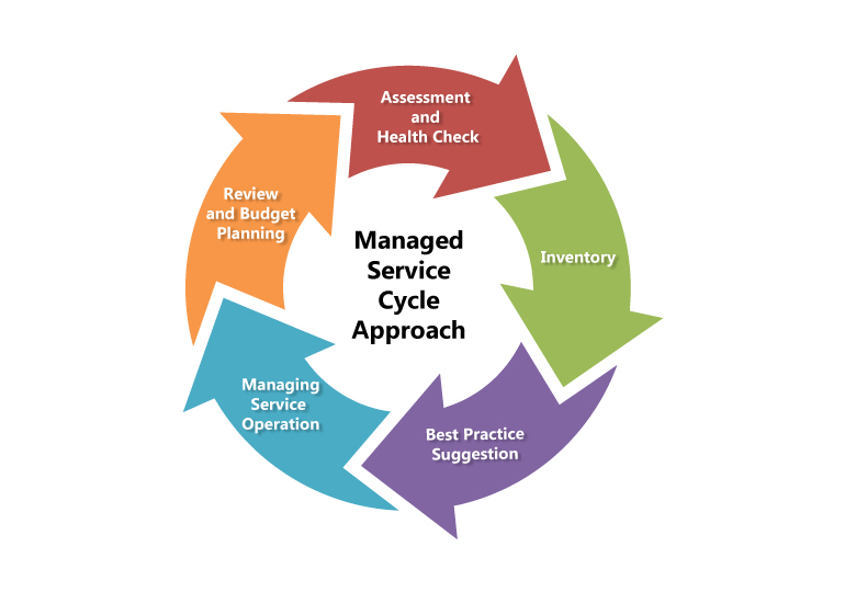 Our IT Managed Service works as a cycle, initiate with assessment and health check. After studying and assessment, we will suggest customer the best practice. Upon the deployment of the service, we will conduct review meeting with customer to check the outcome and performance so to further fine-tune and optimize the server scope and level.