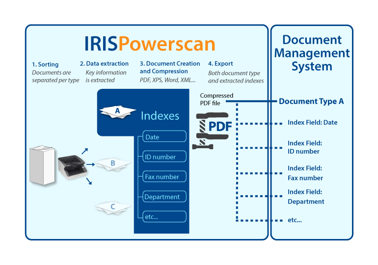 Index fields in IRISPowerscan™ can be mapped to the index fields you already use in your DMS, ECM or Cloud system. Consequently, IRISPowerscan™ can send fully indexed documents to those systems