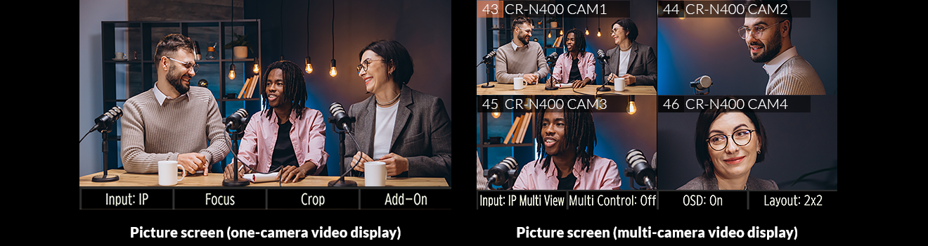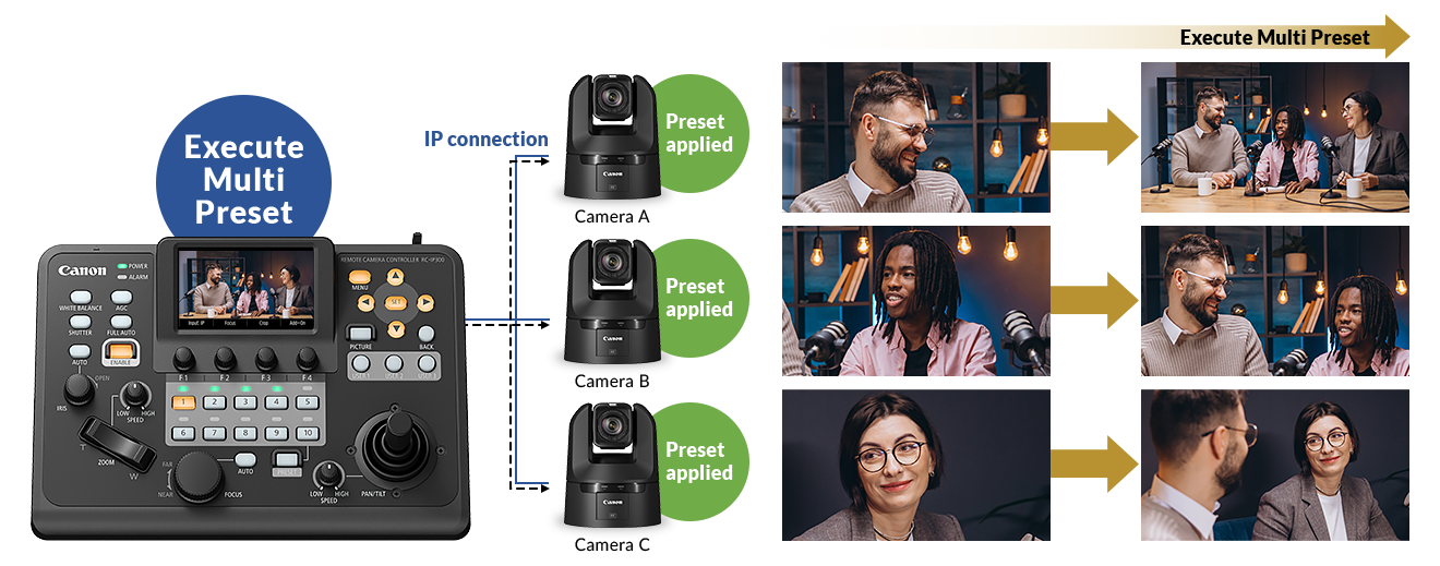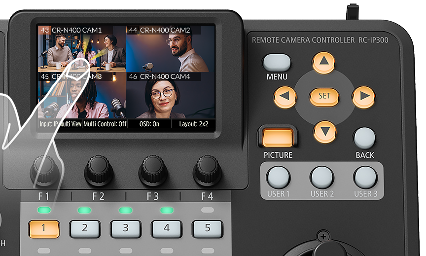 Control up to 200 cameras at once with ease. Instead of recalling the preset of each camera individually, you can recall preset positions for multiple cameras with the Multi Preset simultaneously, ensuring your entire production is ready to roll in seconds.