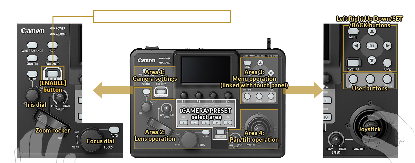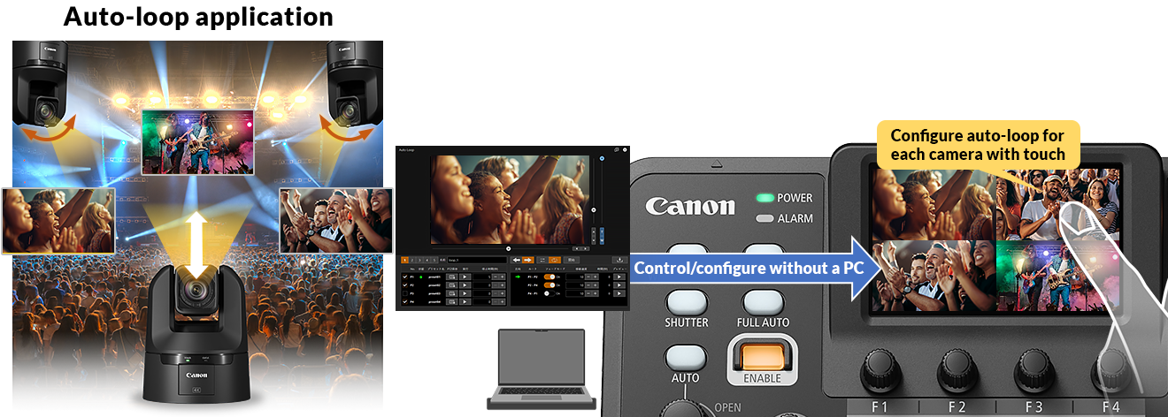 The auto-loop application for each camera can be toggled on and off from the controller. Along with start/stop auto-loop and other basic controls, the touch panel can be used to configure loop operation, loop direction, and more. This enables fine-tuning of control and configurations for auto-loop functions even without a computer.