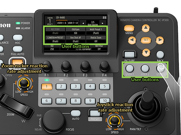 Speed dials can be used to adjust each of the joystick and zoom rocker operational response speeds. The joystick's tilt angle and pan/tilt speed relationship can also be adjusted using the P/T curve settings, letting users customise how control feels.