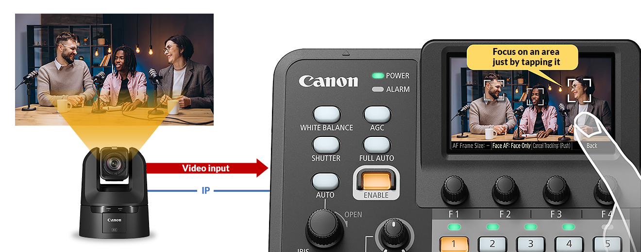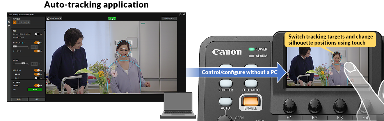 The auto-tracking application for each camera can be toggled on and off from the controller. Along with start/stop auto tracking and other basic controls, the touch panel can be used to switch tracking targets, change composition settings, and more. This enables fine-tuning of control and configurations for auto-tracking functions even without a computer.