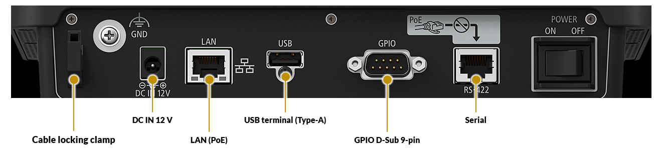 | DC IN 12 V terminal – DC input: DC 11.4 to 12.6 V, 1.0 A LAN terminal – LAN connector, PoE power supply supported (IEEE802.3af compliant) |