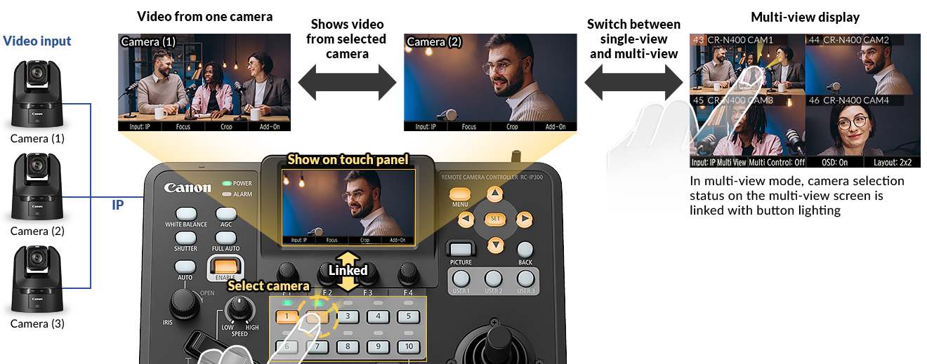 IP video input is supported to enable operation while viewing camera video feeds on the touch panel. The image displayed on the touch panel can also automatically be switched according to the camera for operation, enabling reliable selection of desired cameras even when switching cameras frequently. Video from up to nine cameras can be shown on the panel simultaneously, letting users check video feeds when selecting the camera.