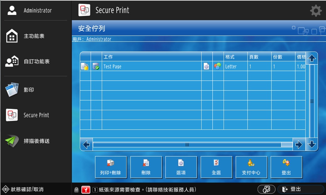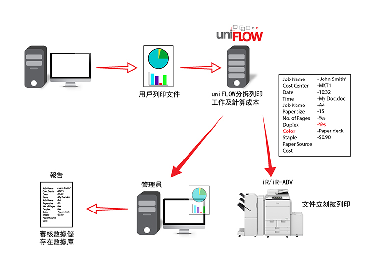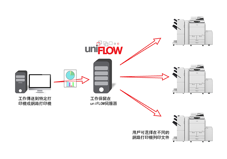 uniFLOW integrates a range of modules such as smart control and print and photocopy output analysis and management. In addition, the system offers management for various machines, including Secure Print anywhere, personal ID authentication, print and photocopy output volume analysis and reports, helping corporate manage internal multifunctional devices more efficiently and thus increase internal productivity.