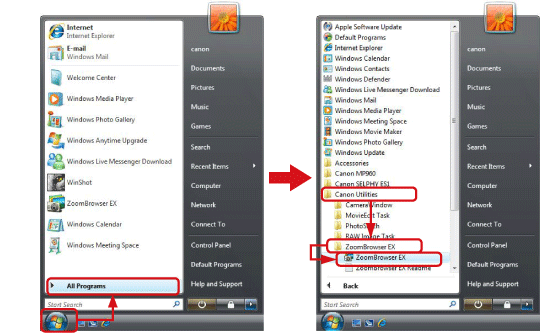) → [All Programs] or [Programs] → [Canon Utilities] → [ZoomBrowser EX] and select [ZoomBrowser EX] to start ZoomBrowser EX.