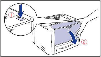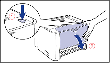 While pressing the open button on the top of the front cover (1), open it gently (2).