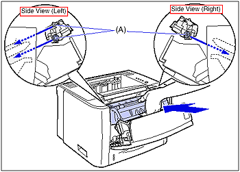 25-3. Push the toner cartridge into the printer firmly until it touches the back of the printer while aligning (A) on both sides of the toner cartridge with the toner cartridge guides inside the printer.