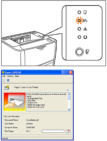 (Paper Jam) indicator (orange) blinks, and the following messages appear in the Printer Status Window.