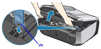 1. Make sure that the machine is turned on, lift the Scanning Unit (Printer Cover) with both hands, then pull the Scanning Unit Support (A) down into place.