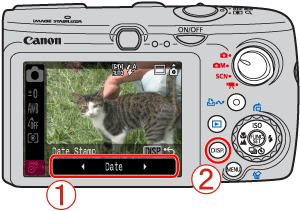 Press the camera button as shown above (right and left), select [Date Stamp] and set it to [Date] or [Date & Time].