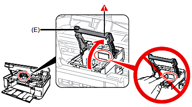 5. Tilt the Print Head forward and set it in place. Lower the Print Head Lock Lever (E) completely.