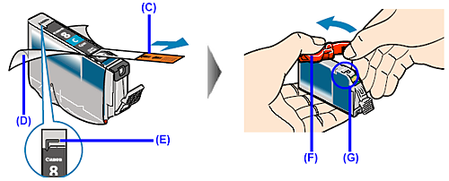 Make sure that the protective film does not remain on the air hole (E). If the air hole is blocked with the remaining film, ink may leak out or may not eject properly.