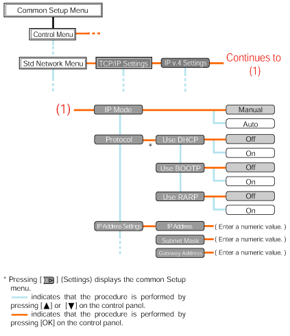 To set the IP address using the printer's control panel, use the following menu hierarchies.