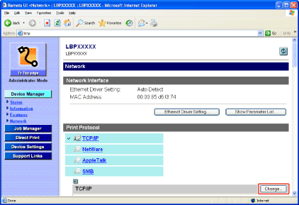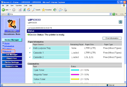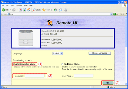 - It is not required to enter any value in [Password]. For details on the procedure for setting and changing the administrator password, see "User's Guide" (HTML manual) in the CD-ROM supplied with the printer.