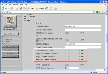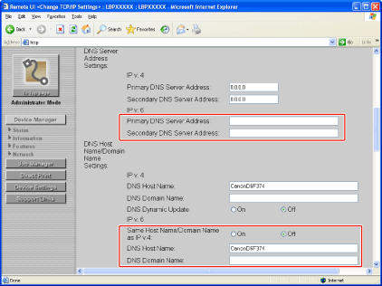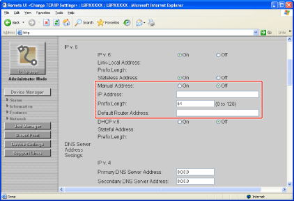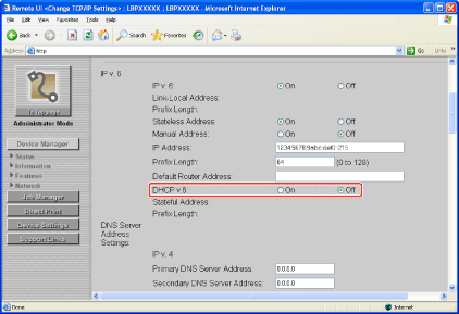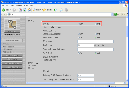 Specify the settings for IP v. 6 using the Remote UI after specifying the settings for IP v. 4.