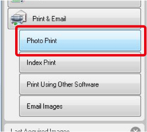 In case of ImageBrowser, select the images to be printed, and then click [Print & Email] in the lower part of the browser window to select [Photo Print] from the menu that appears.