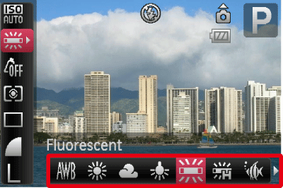 Operate the <directional buttons> left or right to select the [White Balance] mode that you want to change to. (In this case, [Fluorescent] (