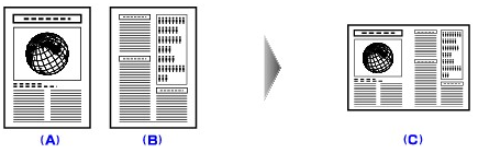 You can copy two original pages (A) (B) onto a single sheet of paper (C) by reducing each image.