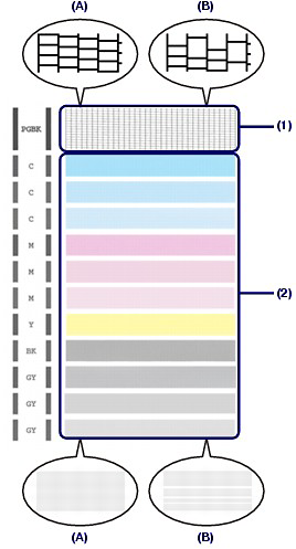 1. Check if there are missing lines in the pattern (1) or horizontal white streaks in the pattern (2).