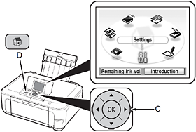 2. Use the Easy-Scroll Wheel (C) to select Settings, then press the OK button.