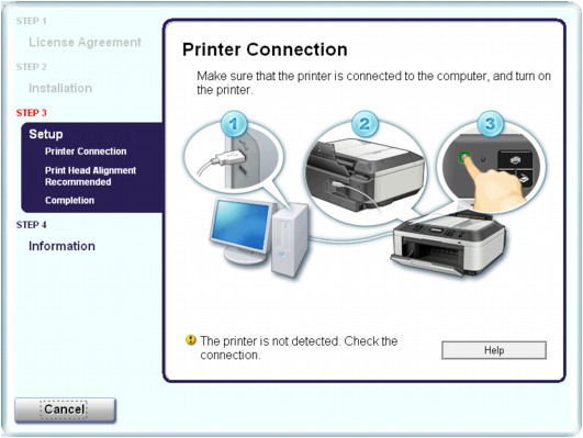 The printer is not detected. Check the connection. may be displayed depending on the computer you use. In this case, follow the procedure below to reinstall the MP Drivers.