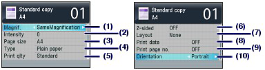 - The settings of the page size, media type, print quality, automatic intensity adjustment, etc. are retained, and these settings will appear next time when the copy mode is selected even if the power is turned off and on.