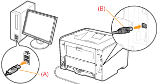 - Square end (B): Connects to the USB connector on this printer.