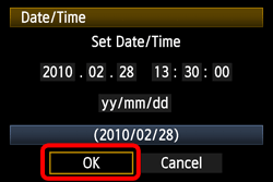 When you turn on the power for the first time or if the date/time has been reset, the Date/Time setting screen will appear. Follow steps below to set the date/time. Note that the date/time appended to recorded images will be based on this date/time setting. Be sure to set the correct date/time.