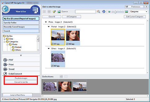 You can edit images or convert them to text using MP Navigator EX or an application that accompanies the machine. After scanning documents and saving them, open the View & Use window to select what you want to do with the images.