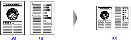 You can copy two original pages (A) (B) onto a single sheet of paper (C) by reducing each image.