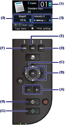- If you return to Standard copy after you selected the copy menu other than Standard copy, press the Stop button. If the number of copies, the magnification, or the intensity has been set already, press the Stop button twice.