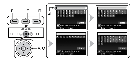 button, then enter characters.* To delete a character, select the section (G) of the screen using the
