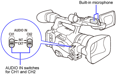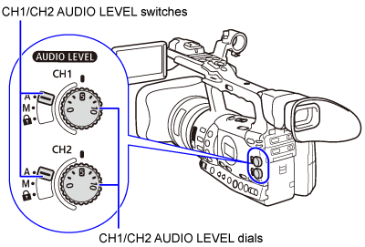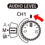 You can set the audio level to auto or manual for each channel. When both CH1 and CH2 are set to the built-in microphone, the settings for CH1 will automatically be applied to CH2.