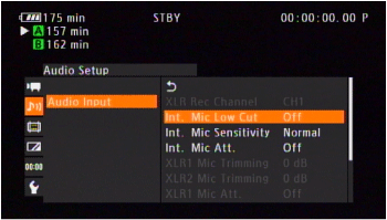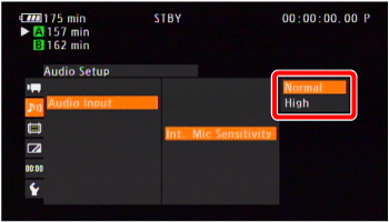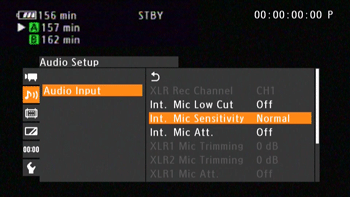 Select [Audio Setup] -> [Audio Input] -> [Int. Mic Sensitivity] in that order.
