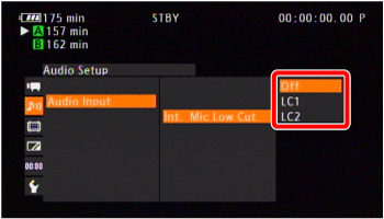 Select [Audio Setup] -> [Audio Input] -> [Int. Mic Low Cut] in that order.