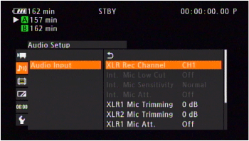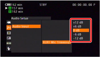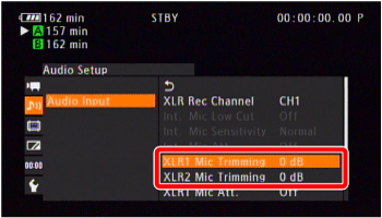 Select [Audio Setup] -> [Audio Input] -> [XLR1 Mic Trimming] or [XLR2 Mic Trimming] in that order.