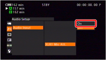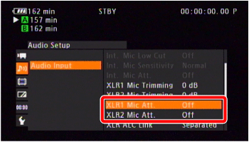 Select [Audio Setup] -> [Audio Input] -> [XLR1 Mic Att.] or [XLR2 Mic Att.] in that order.