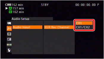 - If [XLR Rec Channel] is set to [CH1/CH2], audio that is input to CH2 cannot be recorded.