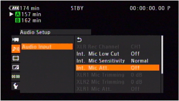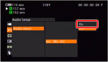 Select [Audio Setup] -> [Audio Input] -> [Int. Mic Att.] in that order.