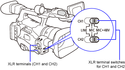 - When using the XLR terminal to record to only one channel, use the CH1 input terminal and set the XLR terminal switch for CH1 to <LINE>, <MIC> or <MIC+48V>.