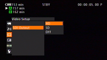 The digital signal output from the HD/SD SDI terminal includes the video signal, audio signal and time code signal. If necessary, perform the following procedure to change the output to HD or SD. Turning the output off will conserve the camcorder’s power.
