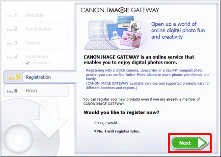 14. The following window appears. Select [No, I will register later.] here, and then click [Next].