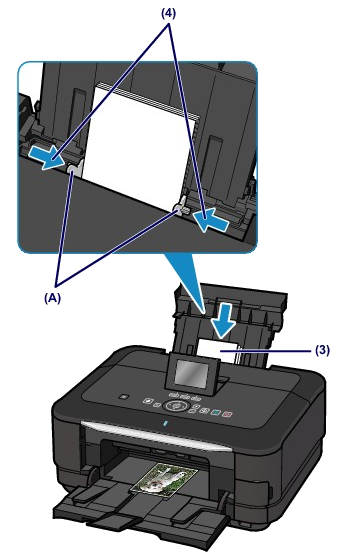 (3) Slide the paper guides (A) to open them, and load the paper in the center of the rear tray WITH THE PRINT SIDE FACING YOU.