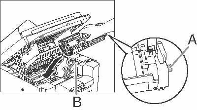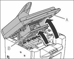 1. Lift the scanning platform (A) until it is locked, and open the printer cover (B).