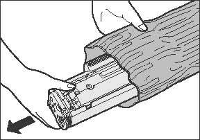 5. Hold the toner cartridge with one hand, and pull the seal completely out.