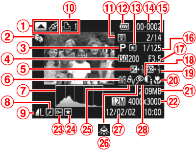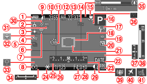 ![]() | Eye-Fi connection status | ![]() | Exposure compensation level |