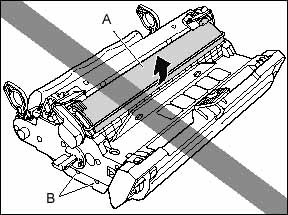 b. Do not hold or touch the imaging transfer belt (B). The image quality may deteriorate. Do not apply shock to the drum cartridge memory (A) or bring it near magnetic waves. It may result in damage to the machine.