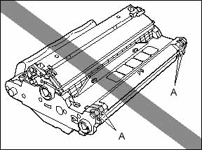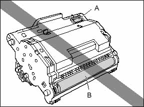 b. Print quality may deteriorate if you touch or damage the drum that is set inside. Be careful not to touch the drum or open the drum protective shutter (A). Be careful not to hold or touch the portions that are not described for this procedure such as the sensors (B). It may result in damage to the machine.