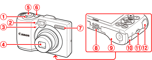 ![]() | Zoom lever Shooting: (telephoto) / (wide angle)Playback: (magnify) / (index) | ![]() | Flash |